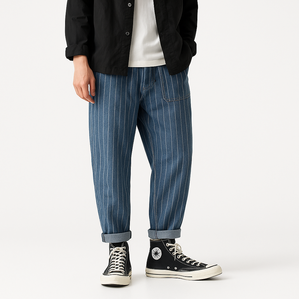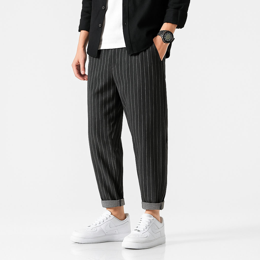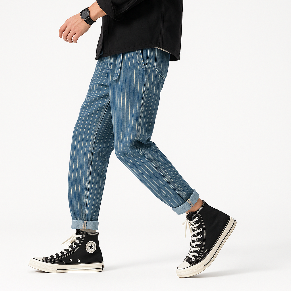 Erhöhen Sie Ihren lässigen Stil mit einem Paar Tabiko-Hosen . Sie haben eine entspannte Passform und einen Kordelzug für eine einfache Anpassung. Dieses Paar in schwarz/blau gestreift ist perfekt für Sommertage am Strand oder auf den Straßen der Stadt.